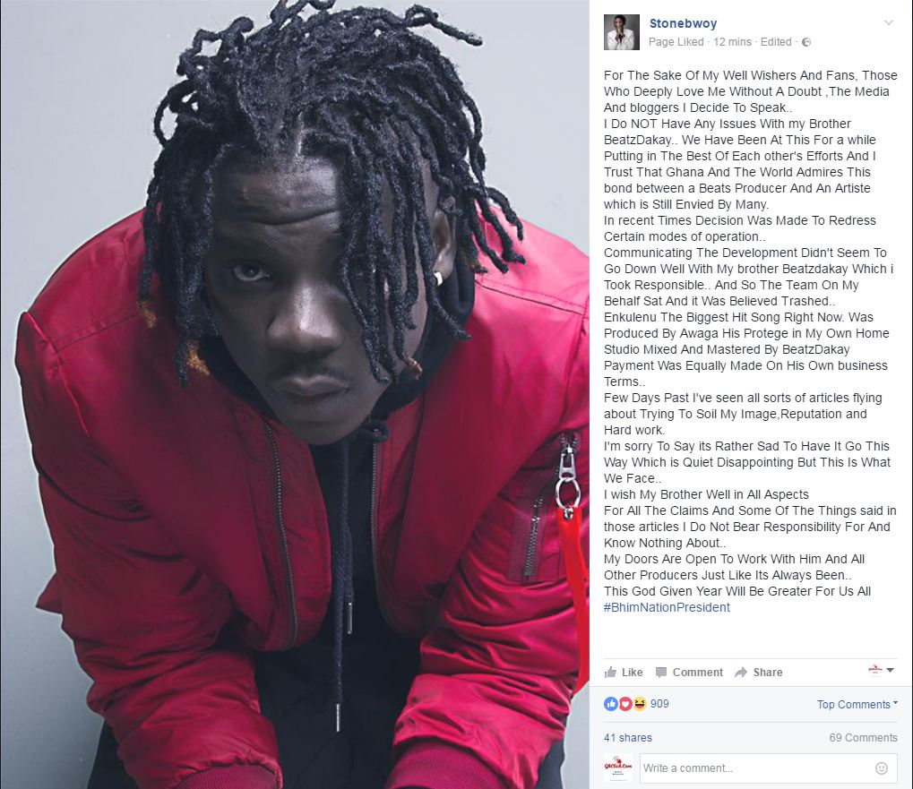 For some few days now we had people saying all sorts of things on social media concerning stonebwoy and his inhouse producer BeatzDakay. people said there was a split between the two,other also claim its due to money issue and a whole lot. the dancehall superstar today took to his facebook page to address the issue. this is what he had to say